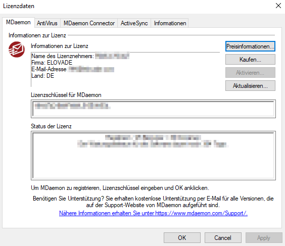 3. Geben Sie bitte den Lizenzschschlüssel im Feld Lizenzschlüssel für MDaemon, ein und beachten Sie hierbei die Groß-/Kleinschreibung. Tipp: Nutzen Sie die Zwischenablage.