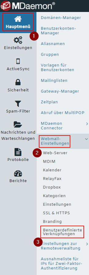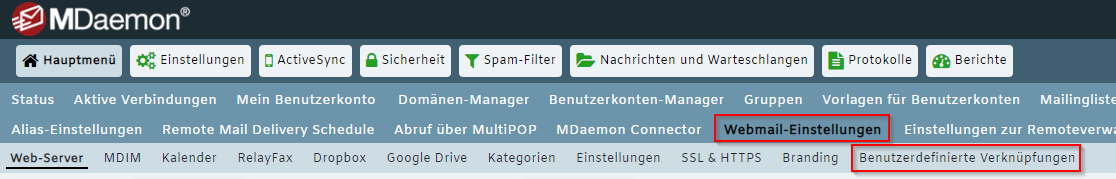 - In Version 22.5.0 des MDaemon E-Mail Server zu finden unter "Webmail-Einstellungen → Benutzerdefinierte Verknüpfungen"