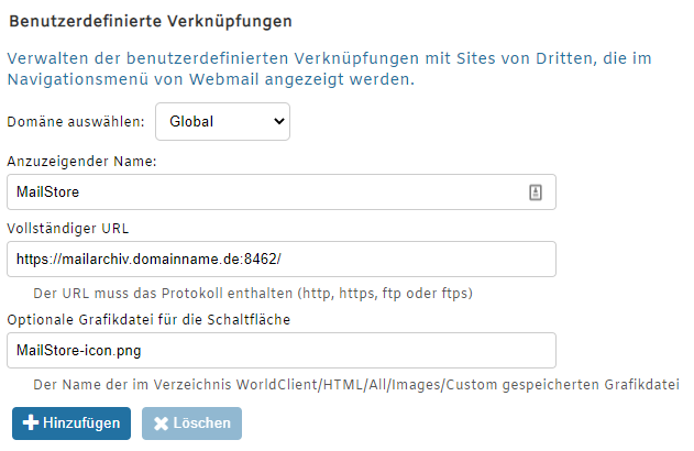 [Default:Settings] … CustomButtonText1=MailStore CustomButtonLink1=https:// mailarchiv.domainname.de:8462/