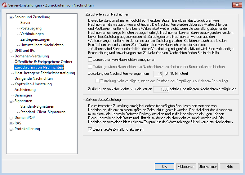 Dafür müssen Sie zunächst im MDaemon Email Server die Option "Zeitversetzte Zustellung aktivieren" aktivieren. Diese finden Sie in der MDaemon-GUI unter Einstellungen → Server-Einstellungen → Zurückrufen von Nachrichten:
