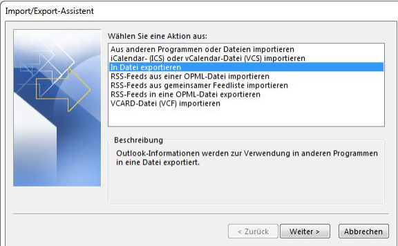 Für den anschließenden Import der bestehenden Kalendereinträge, Kontakte und Notizen werden diese in Form einer .pst-Datei exportiert.