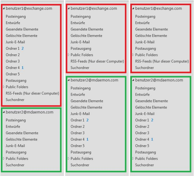 Beim Start von Outlook wird neben dem Exchange-Konto das hinzugefügte MDaemon-Konto angezeigt. Via Drag-and-drop (Beispiel 2) werden Nachrichten und Ordner in das MDaemon-Konto verschoben.