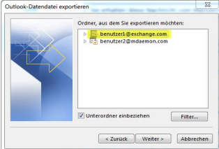 Wichtig: Wählen Sie im nächsten Schritt bitte das Exchange-Konto als den zu exportierenden Ordner aus: