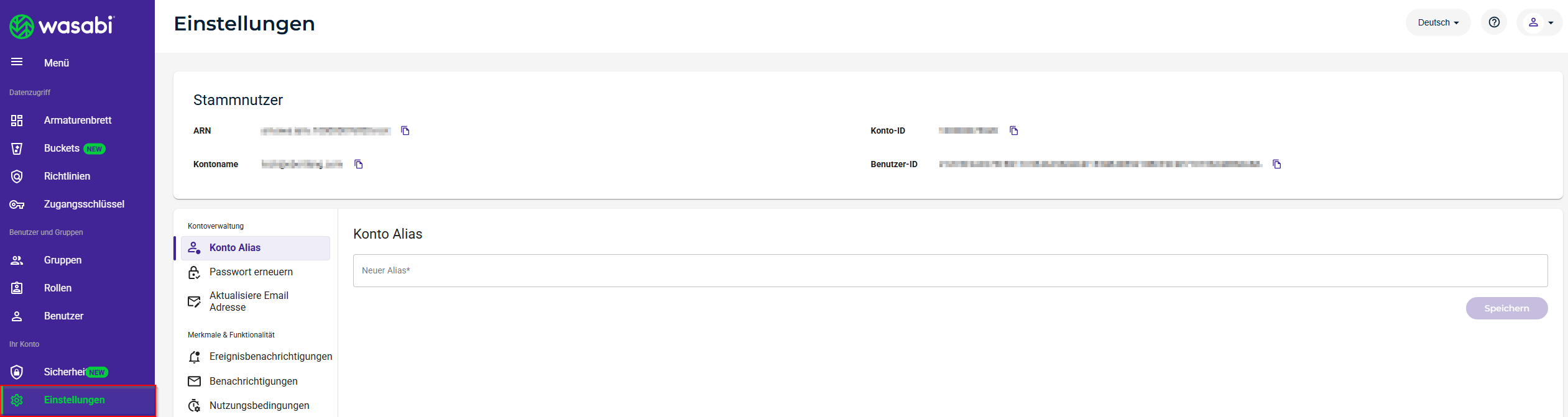 }Setzen Sie für "Destination Root Account ARN" die ARN des Accounts ein, von welchem Sie auch zu Beginn die Access und Secret Keys verwendet haben. Die ARN des Stamm-Accounts finden Sie im linken Menü-Band unter Einstellungen: