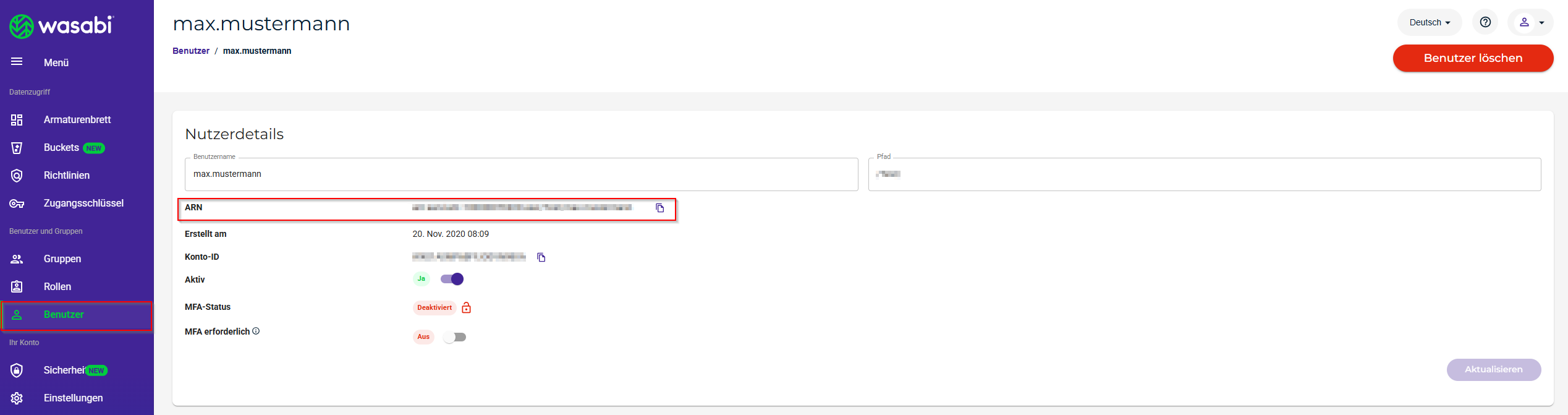 Die ARN eines anderen Benutzers finden Sie unter "Benutzer" per Klick auf den blau hinterlegten Namen des verwendeten Users.