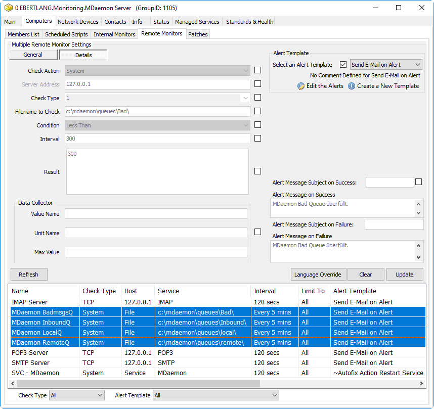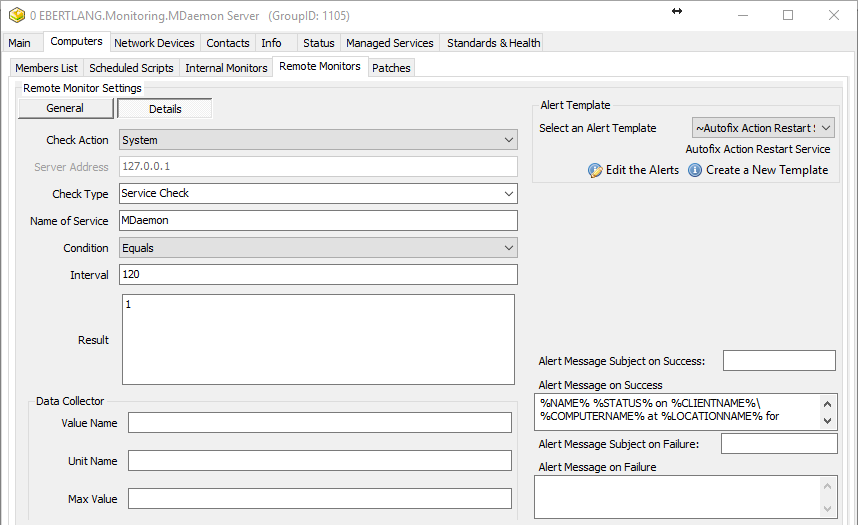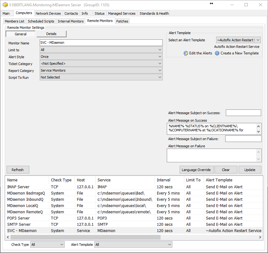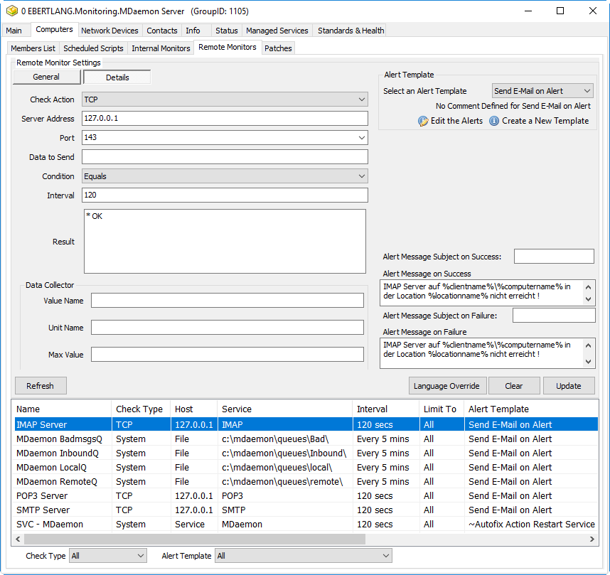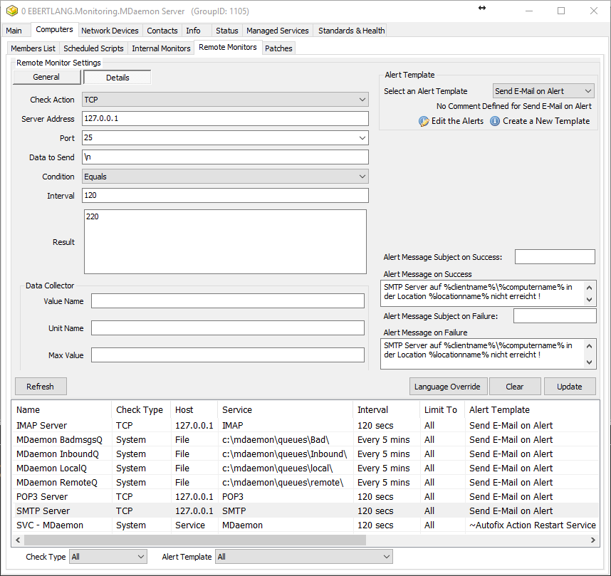 Nun wird eine Überwachung des MDaemon-Dienstes in der erstellten Gruppe unter „Remote Monitors“ eingerichtet.