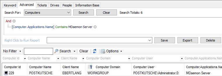 Die abgebildete Suche enthält die Kriterien „Computer.Applications.Name Contains MDaemon Server“.