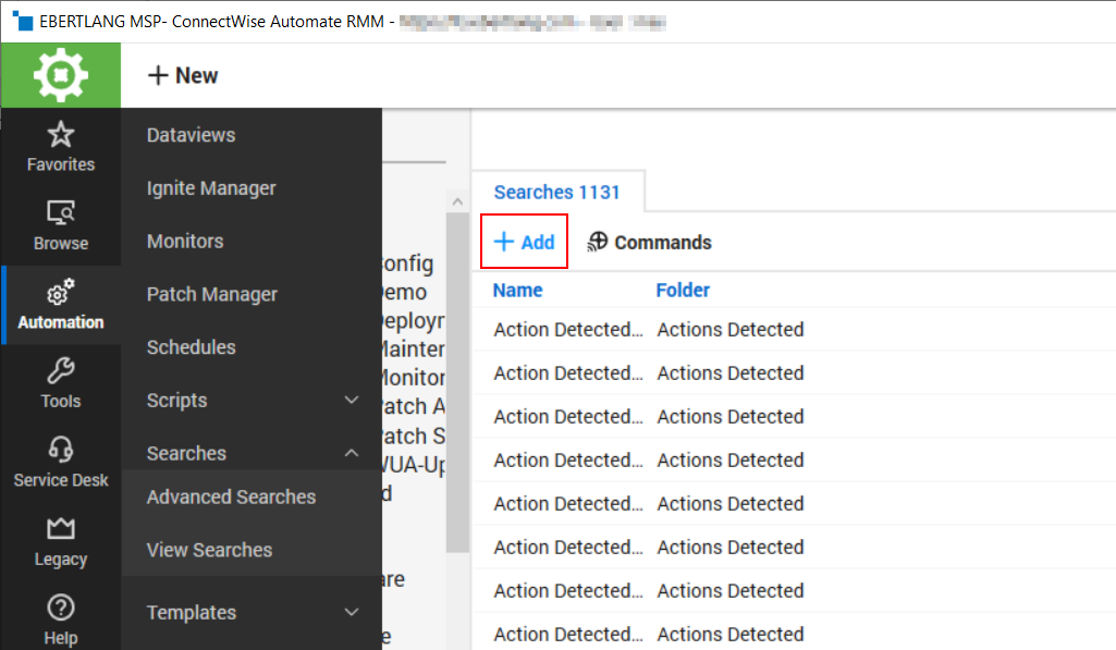 ist, gesucht. Dazu navigieren Sie im Control Center zu Automation > Searches > View Searches. Mit einem Klick auf „+ Add“ erstellen Sie eine neue Suche.
