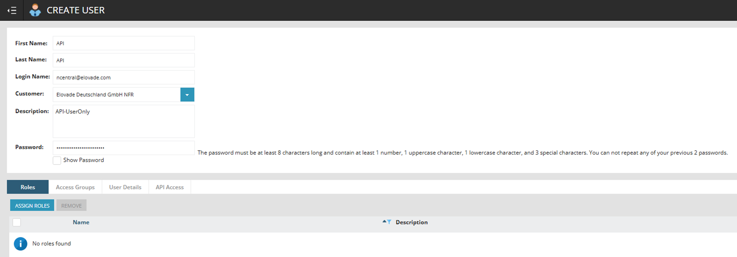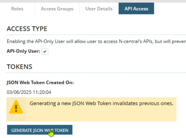 Tipp: Der API-Only-User-Zugriff verhindert den Zugriff auf die N-central-UI. Dies ist besonders wichtig, da die 2-Faktor-Authentifizierung deaktiviert wurde.