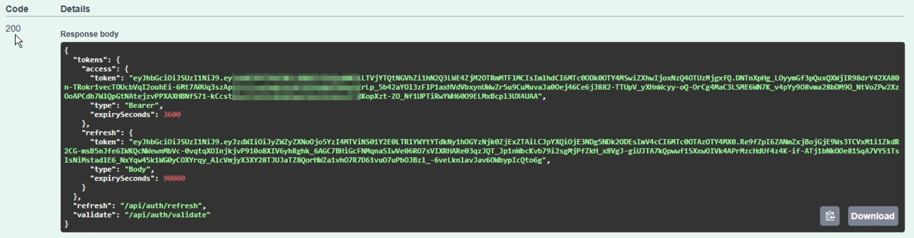2.4 Als Antwort sollten Sie einen Code 200 mit einem Token des Typs Bearer erhalten.