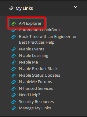 2.1 Um den API Explorer zu öffnen, wählen Sie in der Menüleiste unter "My Links" den Punkt API Explorer aus. Alternativ können Sie diesen erreichen, indem Sie Ihrer N-central-FQDN die Endung "/api-explorer" anhängen.