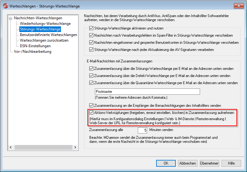 Die Option zum Aktivieren der Funktion finden Sie in der MDaemon-Verwaltungskonsole über den Menüpfad "Warteschlange > Nachrichten-Warteschlangen / DSN... > Störungs-Warteschlange" und nennt sich "Aktions-Verknüpfung in Zusammenfassung aufnehmen". Diese Option ist standardmäßig aktiviert.