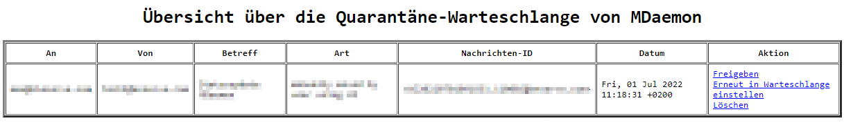 Der MDaemon Email Server bietet seit Version 22.0.0 die Möglichkeit, Nachrichten, die aus beliebigen Gründen in der Störungs-, Quarantäne- oder Defekt-Warteschlange gelandet sind, durch einen Link direkt aus der Zusammenfassungsnachricht heraus freigeben zu lassen.