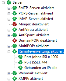 Dafür muss der Server über eine öffentliche Domäne verfügen, welche mit einem A/AAAA-Record auf die öffentliche IP des Servers verweist. Es muss sichergestellt werden, dass entweder der HTTP Port 1000 oder der HTTPS Port 444 auf den Server weitergeleitet werden. Unsere Empfehlung ist, nur per HTTPS auf den Server zugreifen zu lassen. Wie genau dies durchgesetzt werden kann, finden Sie weiter unten unter dem Punkt HTTPS. Für eine erfolgreiche Verbindung muss sowohl in der Firewall des Servers, als auch auf allen davor liegenden Routern und Firewalls der entsprechende Port freigegeben und weitergeleitet werden. Die genau verwendeten Ports und ob die entsprechenden Dienste dafür laufen, können Sie in der MDaemon-Verwaltungskonsole unten links unter "Server" finden.