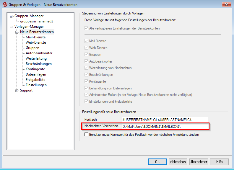 Benutzerkonten → Gruppen & Vorlagen → Vorlagen-Manager → Neue Benutzerkonten → Nachrichten Verzeichnis
