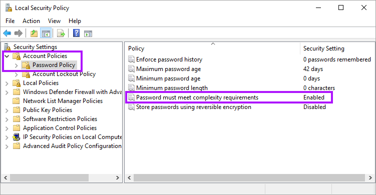 Die Einstellung für die Kennwortkomplexität unter Sicherheitseinstellungen → Kontorichtlinien → Kennwortrichtlinien muss aktiviert sein.
