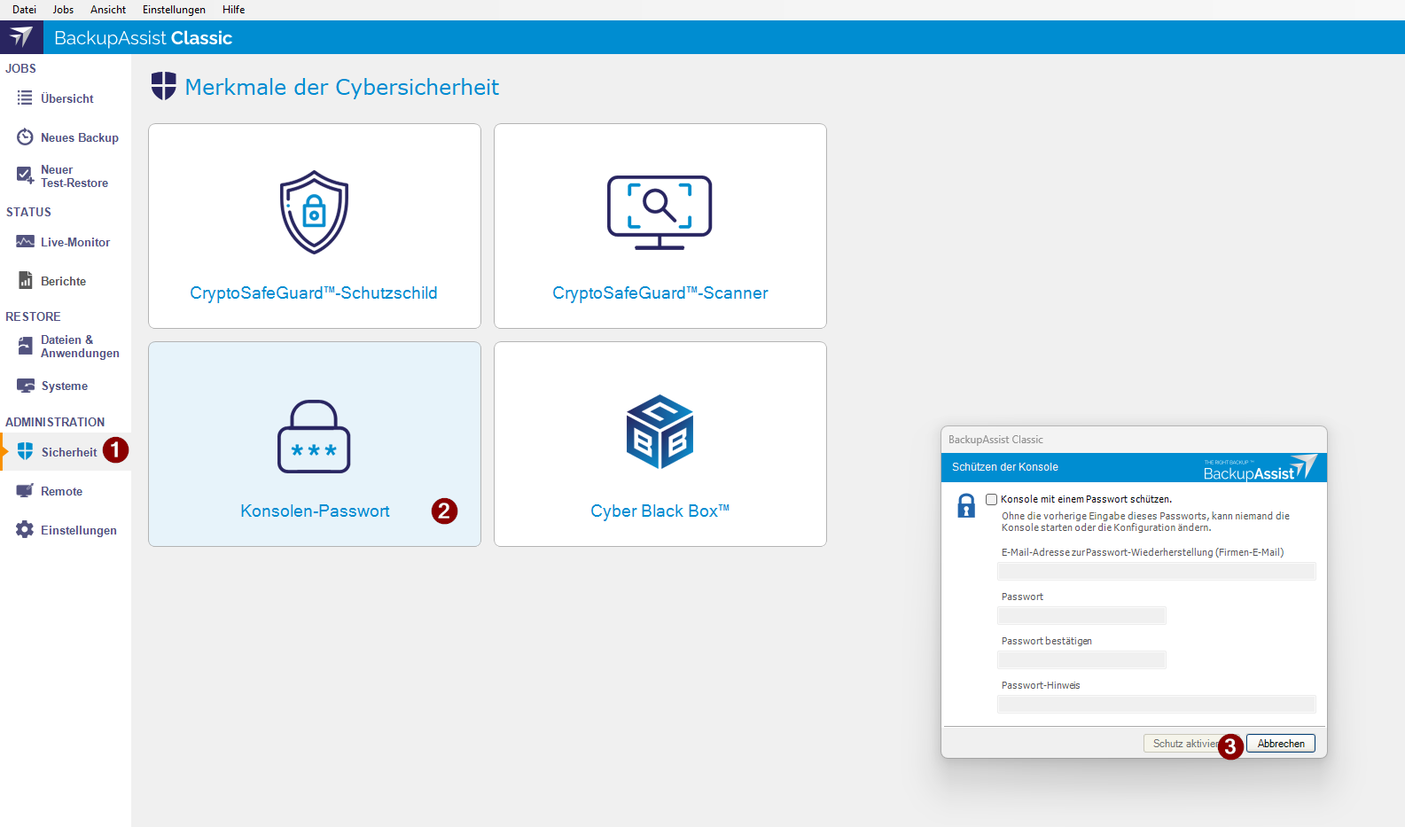 Um den Zugriff von nicht autorisierten Benutzern zu verhindern, stellt Ihnen die Backup-Lösung BackupAssist Classic die Möglichkeit zur Verfügung, Ihre Konsole mit einem Passwort zu schützen. So wird verhindert, dass nicht autorisierte Benutzer Änderungen an Ihrer Konfiguration oder ungeplante Sicherungen durchführen können. Nach Einrichtung des Schutzes wird beim Start der Konsole jeweils ein Passwort verlangt.