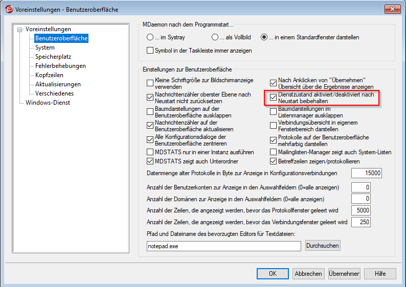 5. Aktivieren Sie die Option Dienstzustand aktiviert/deaktiviert nach Neustart beibehalten.