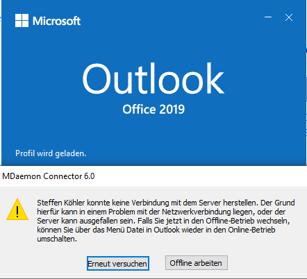 Trotz korrekter Client- und Server-Konfiguration ist der MDaemon Connector for Outlook für verschiedene Benutzer nur sporadisch oder gar nicht erreichbar. Eine Outlook-Profilverbindung kann nicht hergestellt werden.