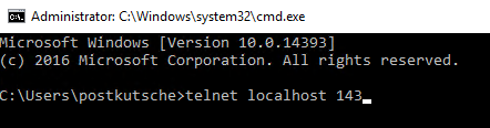 Als nächstes öffnen Sie die cmd, gefolgt von dem Befehl "telnet". Hier geben Sie nun die IP-Adresse oder den FQDN des Servers ein; danach wählen Sie den entsprechenden Port aus (beispielsweise 143 für IMAP und 993 für IMAP-SSL). So können Sie die grundlegende Erreichbarkeit des Servers prüfen und feststellen, welcher Dienst antwortet.