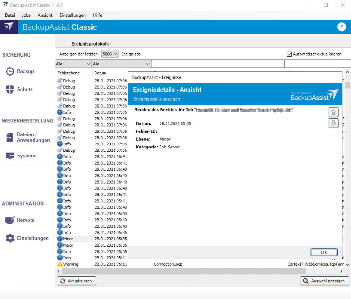 Prüfen Sie bitte zunächst das Event Log in BackupAssist unter "Ansicht | Ereignisprotokolle".