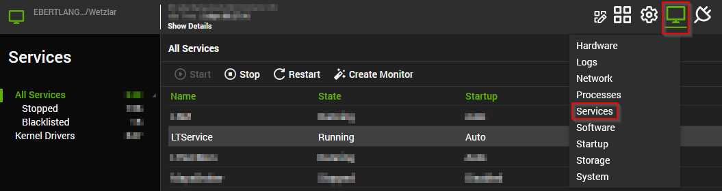Hinweis: Nachdem an dem Host Änderungen vorgenommen wurden, muss die Network Probe Detection erneut durchgeführt werden. Starten Sie dafür den ConnectWise Automate-Dienst auf dem Probe einmal neu. Öffnen Sie dazu die Computer-Management-Oberfläche im "Browse"-Tab des Control Centers und wählen dann nach einem Rechtsklick auf den "Device"-Tab "Services" aus.