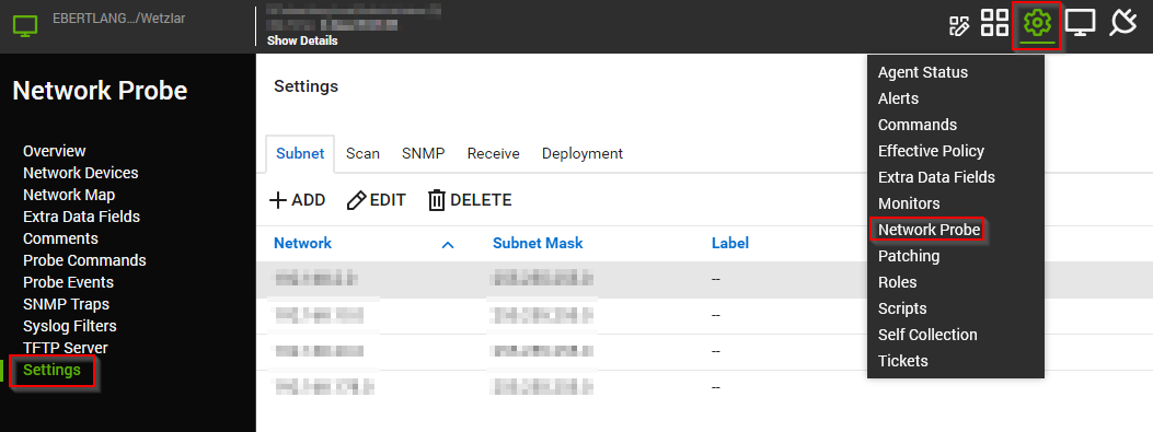 - Prüfen Sie, dass die IP-Adresse des VMware-Hosts unter dem "Network Devices"-Subtab im "Browse"-Tab des Control Centers aufgeführt wird. Sollte dies nicht der Fall sein, korrigieren Sie die IP-Range, die von dem Network Probe gescannt wird. Öffnen Sie dafür auf dem Network Probe über den "Automation" Tab das Network Probe-Menü und prüfen und korrigieren Sie gegebenenfalls die Settings.