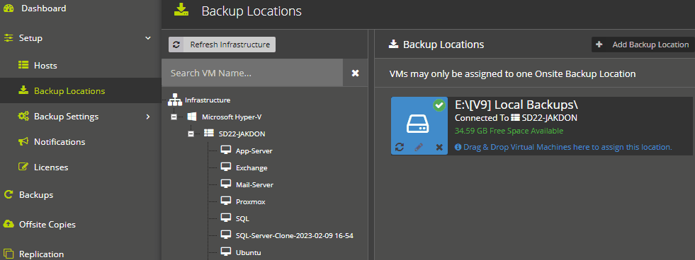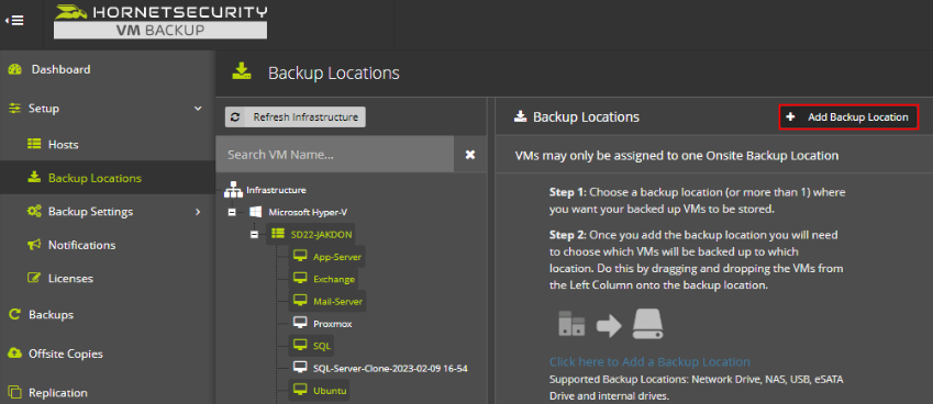 Wählen Sie anschließend Ihren primären Backup-Speicherort. Gehen Sie zu [Setup] > [Backup Locations] > [Add Backup Location].