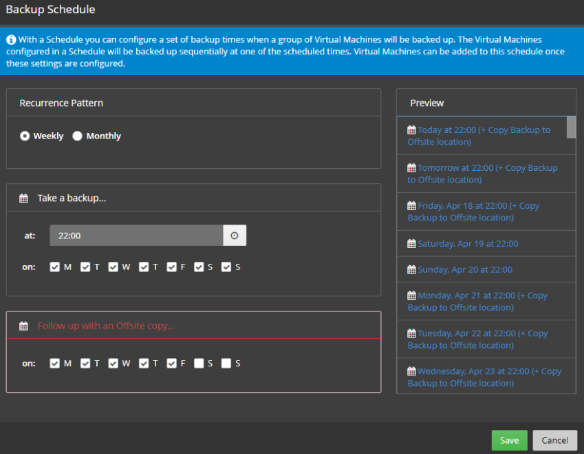 Wählen Sie hier Ihr Wiederholungsmuster (wöchentlich oder monatlich), anschließend die Uhrzeit und die Wochentage, an denen der Zeitplan ausgeführt werden soll. Auf der rechten Seite sehen Sie eine schnelle Vorschau, wann der Zeitplan ausgeführt wird. Klicken Sie auf [Save], wenn Sie fertig sind. Der neue Zeitplan wird anschließend in der Zeitplan-Übersicht angezeigt.