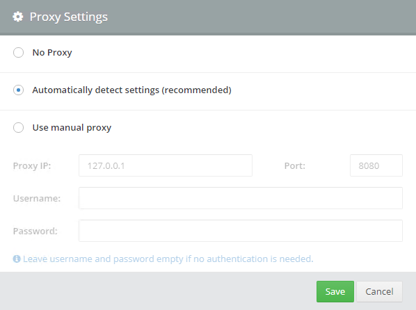 Im sich öffnenden Menüfenster können Sie Ihre gewünschten Proxy-Einstellungen setzen. Mit "Save" speichern Sie alle vorgenommenen Einstellungen ab.