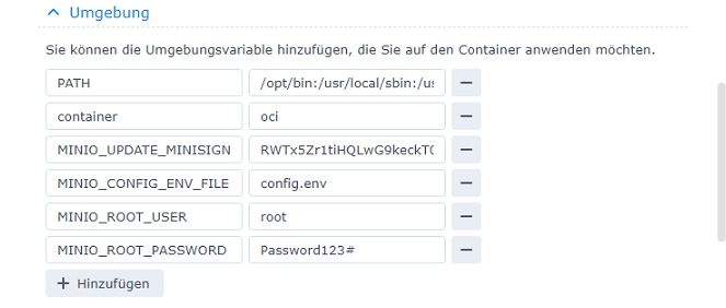 Fügen Sie anschließend bitte die Variablen "MINIO_ROOT_USER" und "MINIO_ROOT_PASSWORD" hinzu und weisen Sie diesen entsprechende Values für Ihren Login zu. Diese werden später verwendet, um das Login an der MinIO Weboberfläche durchzuführen:
