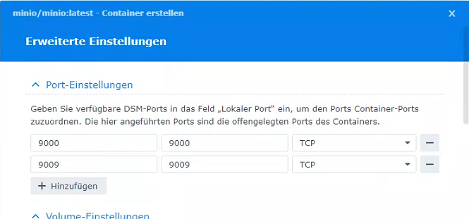 Fügen Sie hier zunächst unter "Port-Einstellungen" einen Port hinzu, welchen Sie für die S3 Verbindung verwenden wollen. Fügen Sie außerdem einen Port hinzu, welchen Sie für das MinIO Web-Interface nutzen möchten.