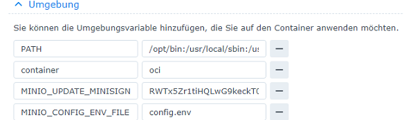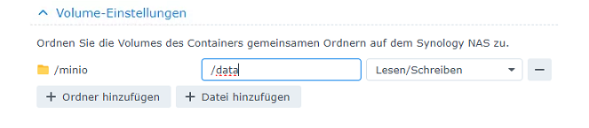 Geben Sie unter "Volume-Einstellungen" bitte den zuvor erstellten MinIO-Ordner an und tragen Sie in das 2. leere Feld "/data" ein, damit MinIO diesen Ordner als Datenablage verwendet.