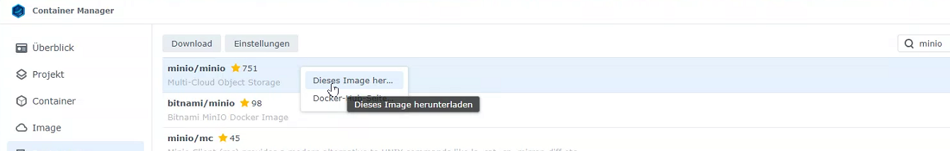 Suchen Sie nach MinIO und laden Sie dieses mit einem "Rechtsklick → Dieses Image herunterladen herunter". Wählen Sie "latest" aus.