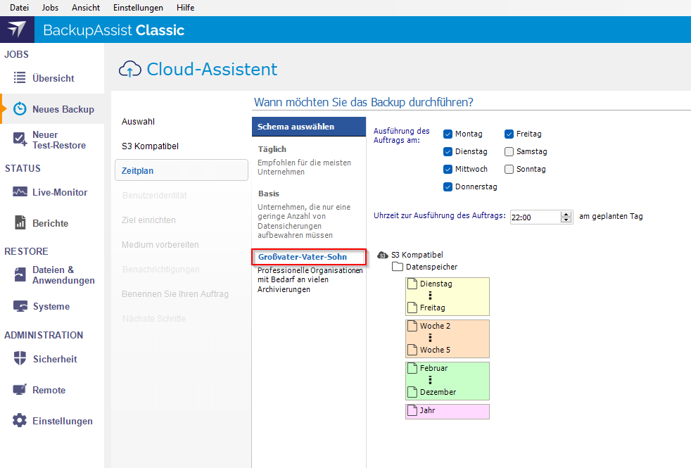 Wählen Sie im Reiter Zielmedium jetzt die Option S3-kompatible Cloud-Speicherung aus und definieren Sie dann den von Ihnen gewünschten Zeitplan mit Schema (wir empfehlen "Großvater-Vater-Sohn") sowie die Uhrzeit aus: