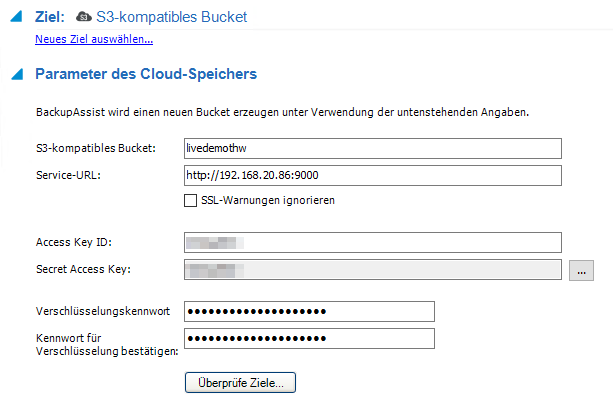 - Tragen Sie unter "Service-URL" den FQDN/die IP Ihres Windows-Gerätes sowie den Port (http://IP:9000) ein und geben Sie anschließend Ihren Access Key sowie Ihren Secret Key ein. Konfigurieren Sie das Backup im internen Netz, so muss der lokale Port genutzt werden. Im externen Netz muss entsprechend der Container-Port genutzt werden. Tragen Sie außerdem ein sicheres Verschlüsselungskennwort ein und dokumentieren Sie dieses: