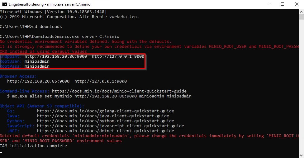 minio.exe server [Speicherpfad aus Punkt b] - Danach werden im entsprechenden Ordner ein MinIO-Verzeichnis und alle zukünftigen Buckets angelegt