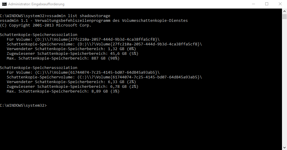 Hin und wieder kann es sein, dass noch kein Speicherbereich für Schattenkopien zugewiesen wurde. Um eine Volumeschattenkopie-Speicherassoziation zu erstellen, müssen Sie folgenden Befehl absetzen: