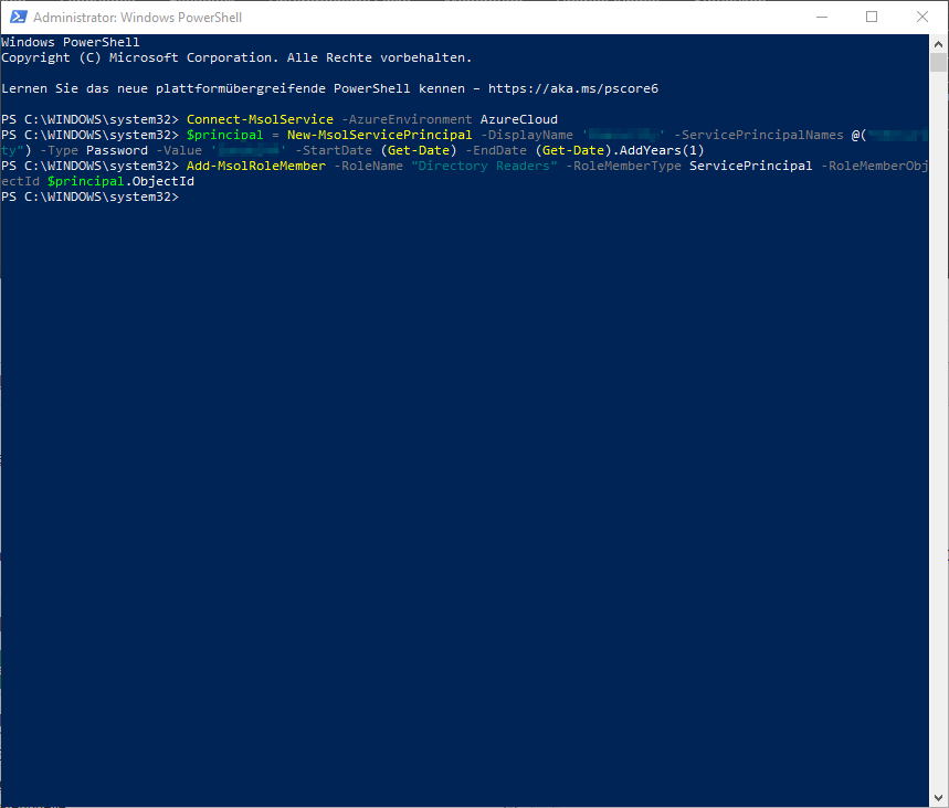Das Dienstprinzipal-Objekt wird erstellt und in der Variablen $principal gespeichert. Das Passwort des Prinzipals ist standardmäßig ein Jahr ab dem Erstellungsdatum gültig. Sie müssen in dem Befehl noch den gewünschten Benutzernamen und das gewünschte Kennwort einsetzen. In diesem Fall würden wir hier als Namen "Security" und "PasswortIhrerWahl" eingegeben. Zu guter Letzt muss dem Prinzipal die "Directory Readers"-Rolle hinzugefügt werden – das ist nötig, weil der Dienstprinzipal in der Lage sein muss, die Informationen aus dem Azure-AD auszulesen. Das nachfolgende Kommando erledigt dies: