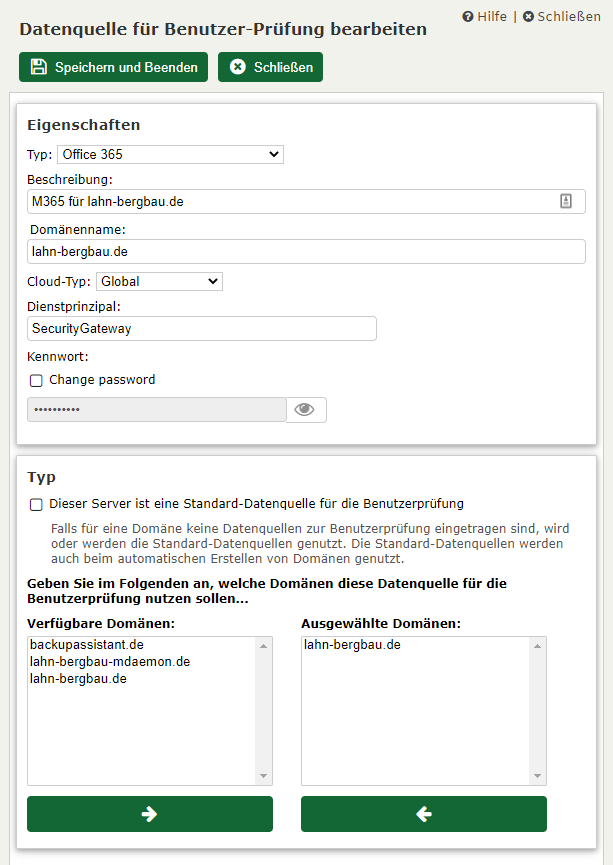 Es sind mehrere Schritte nötig, um eine Office 365-Domäne als Benutzerquelle einzurichten. Zuerst muss in SecurityGateway die Quelle als solche eingerichtet werden.