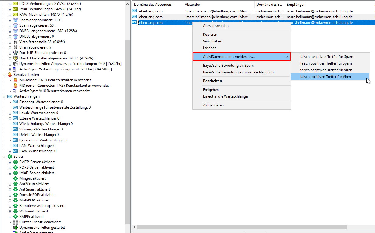 Senden von False-Positive-/False-Negative-Nachrichten direkt aus der Warteschlange an MDaemon Technologies