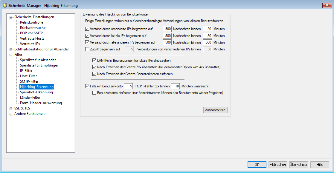 Die Einstellungen dazu finden man in MDaemon unter Sicherheit → Sicherheits-Manager → Filter und dort in dem Reiter Hijacking-Erkennung
