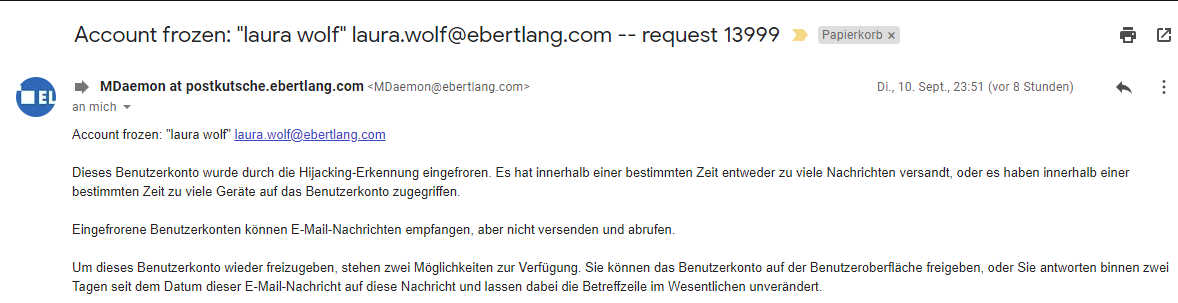 Außerdem wird das betroffene Benutzerkonten eingefroren. Ein eingefrorenes Benutzerkonto kann weiterhin E-Mails empfangen, jedoch nicht mehr versenden.