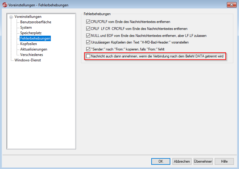 Im MDaemon Email Server ist die Option "Nachricht auch dann annehmen, wenn eine Verbindung nach dem Befehl DATA getrennt wird", die Sie unter Einstellungen → Voreinstellungen → Fehlerbehebung finden, standardmäßig deaktiviert.