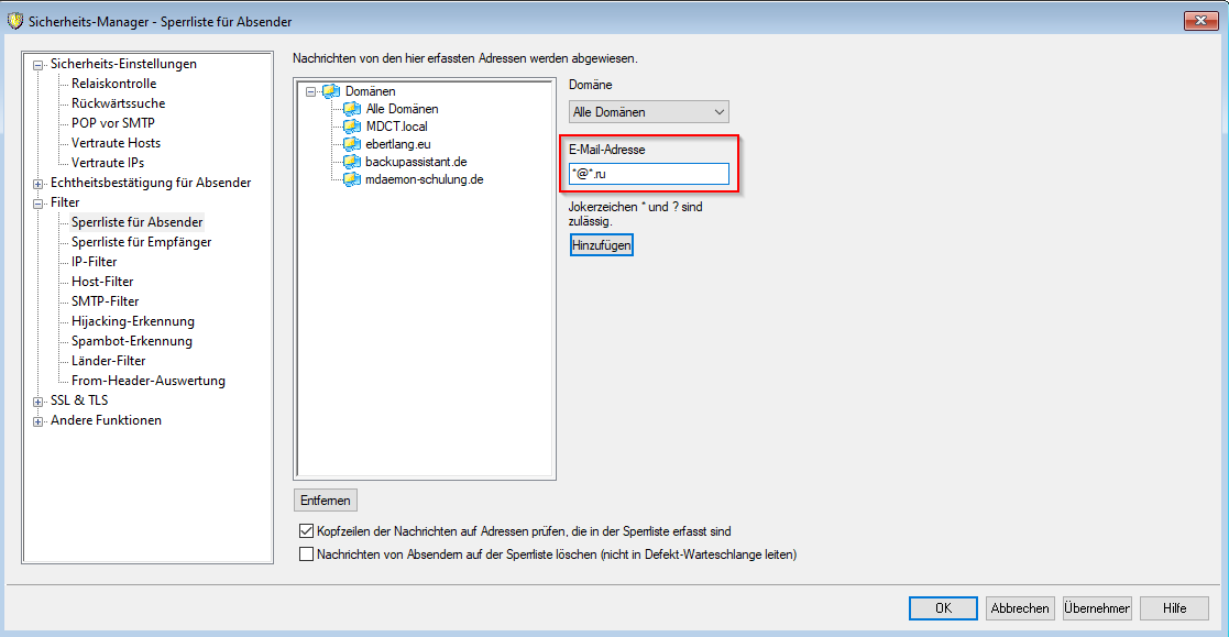 Sperrliste für Absender: Domänen oder E-Mail-Adressen abweisen