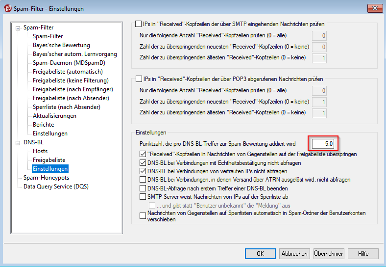 Hier wird dann pro Treffer eine negative Spam-Bewertung von drei Punkten addiert. Diesen Wert kann man aber auch erhöhen:
