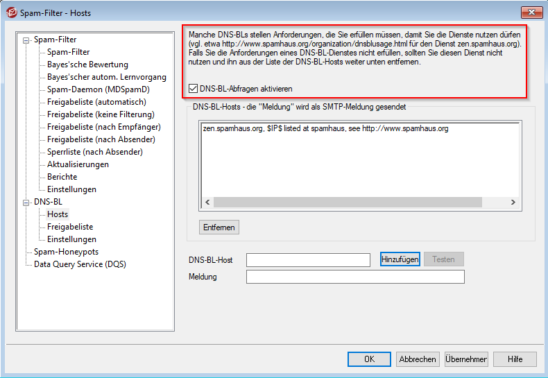 Aktivieren Sie im Bereich "Hosts" bitte die DNS-BL-Abfrage: