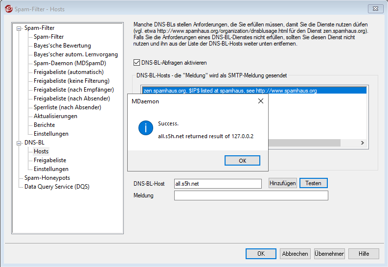 Tragen Sie diesen bitte anschließend ebenfalls wieder in MDaemon unter Sicherheit → Spam-Filter → DNS-BL → Hosts im Feld DNS-BL-Host ein.