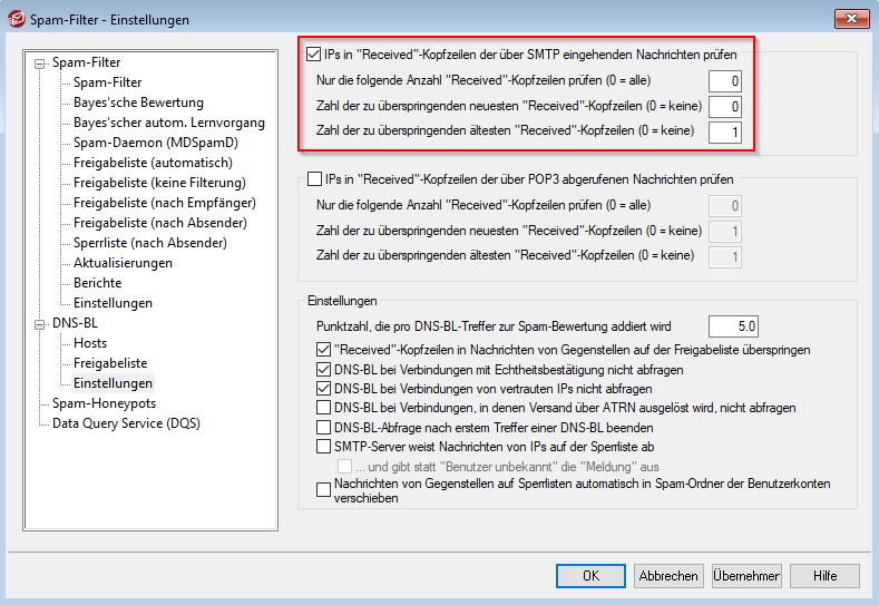 Wenn Sie diese Option aktivieren möchten, dann gibt es weiter unten noch die Möglichkeit, nur eine bestimmte Anzahl an Received-Headern zu überprüfen, eine oder mehrere neue Received-Kopfzeilen zu überspringen oder eine bzw. mehrere ältere Received-Kopzeilen zu überspringen.