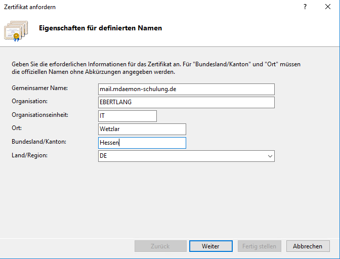 ; Bitte den FQDN von MDaemon eintragen, sowie Ihren Firmename, Ort, das Bundesland und das Land